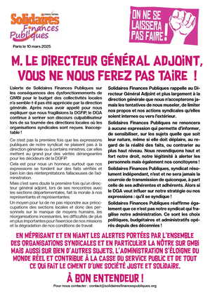 Solidaires Finances Publiques, syndicat résolument indépendant, n’est et ne sera jamais la courroie de transmission de quiconque, à part celle de ses adhérentes et adhérents. Alors si le DGA veut influer sur notre stratégie ou nos expressions : qu’il se syndique !