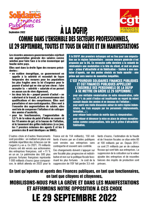 C’est pourquoi Solidaires Finances Publiques et CGT Finances Publiques appellent l’ensemble des personnels de la DGFiP à se mettre en grève le 29 septembre :