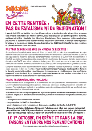 En cette rentrée, Solidaires Finances Publiques est plus que jamais déterminé pour défendre la DGFiP, ses missions et ses agents mais aussi plus globalement pour que la justice fiscale, sociale et environnementale devienne une réalité !