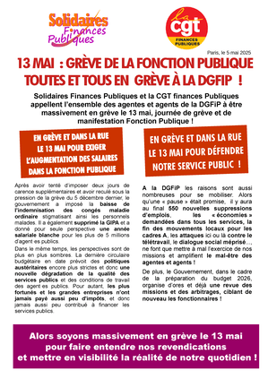 Solidaires Finances Publiques et la CGT finances Publiques appellent l’ensemble des agentes et agents de la DGFiP à être massivement en grève le 13 mai, journée de grève et de manifestation Fonction Publique !