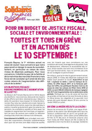 Depuis les annonces du 15 juillet, une vague d’indignation et de colère s’est développée dans tous les secteurs professionnels et parmi une grande partie de la population. Cette colère prend différentes formes au fil des jours et bouscule jusqu’au plus haut niveau de l’État. Depuis cet été, la date du 10 septembre s’est inscrite dans le paysage. Solidaires Finances Publiques appelle, dès ce jour là, à se mettre en grève et à participer à l’ensemble des actions qui auront lieu sur le territoire. C’est pour les agentes et agents des Finances Publiques l’occasion de rappeler que de l’argent, il y en a - et aux Finances, on le sait ! Le 10 est une première étape essentielle pour exprimer notre colère face aux politiques budgétaires qui appauvrissent le plus grand nombre et détruisent les services publics. Elle ne s’arrêtera pas là : d’ores et déjà, avec ou sans Bayrou, l’intersyndicale interprofessionnelle appelle à une nouvelle journée de grève le 18 septembre. En attendant, montrons dès le 10 septembre notre détermination à imposer nos revendications.