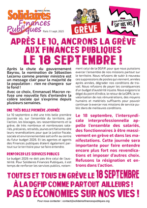 Le 10 septembre a été une très belle première journée où, sur l’ensemble du territoire, par l’action, les blocages, les rassemblements et la grève, de très nombreux et nombreuses salarié·es, précaires, retraités, jeunes ont fait entendre leurs revendications pour que la justice fiscale, sociale et environnementale soit enfin au centre du futur budget 2026. Et les agentes et agents des Finances publiques étaient également partout sur le territoire pour se faire entendre.