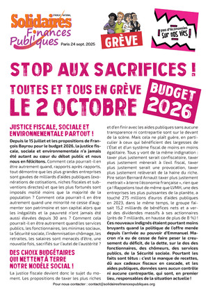 Depuis le 15 juillet et les propositions de François Bayrou pour le budget 2026, la justice fiscale, sociale et environnementale n’a jamais été autant au cœur du débat public et nous nous en félicitons. Comment cela pourrait-il en être autrement quand, rapports après rapports, tout démontre que les plus grandes entreprises sont gavées de milliards d’aides publiques (exonérations de cotisations, niches fiscales et subventions directes) et que les plus fortunés sont imposés moitié moins que la majorité de la population ? Comment cela pourrait-il en être autrement quand une minorité ne cesse d’augmenter son patrimoine et son capital alors que les inégalités et la pauvreté n’ont jamais été aussi élevées depuis 30 ans ? Comment cela pourrait-il en être autrement quand les services publics, les fonctionnaires, les minimas sociaux, la Sécurité sociale, l’indemnisation chômage, les retraites, les salaires sont menacés d’être, une nouvelle fois, sacrifiés sur l’autel de l’austérité ?