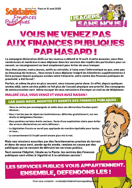 Vous êtes jeunes, moins jeunes, actifs ou retraités, à l’aise avec l’informatique ou pas, avec peu ou beaucoup de revenus... Vous tenez à vous déplacer malgré les kilomètres supplémentaires à faire puisque depuis quelques années votre trésorerie, votre centre des finances publiques de proximité ont été fermés !