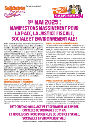 Cette année la journée internationale des travailleurs et travailleuses se déroule dans un contexte inédit de tensions internationales et de guerres en Europe comme ailleurs. C’est dans ce contexte, qu’Emmanuel Macron et le gouvernement Bayrou préparent les esprits à une « économie de guerre » qui sera un nouveau prétexte à amplifier leurs attaques contre notre modèle social, nos services publics, nos missions et nos emplois. Les premières discussions sur le budget 2026 et l’annonce par le Ministre de l’économie de 40 milliards d’économies supplémentaires montrent d’ores et déjà l’ampleur des futures régressions. L’école, la Santé, la protection sociale, la culture, les finances publiques, les solidarités inter-générationnelles, les collectivités territoriales... vont continuer à être dépecées au détriment de la majorité de la population.