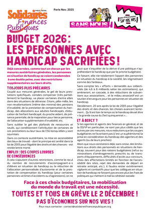 Si les agentes et agents des finances en général, et de la DGFiP en particulier, ne sont pas plus ciblés que les autres par ces mesures, nous redoutons que les coupes budgétaires ne favorisent pas (c’est un euphémisme) la prise en considération du handicap des agentes et des agents (ou de leurs proches).