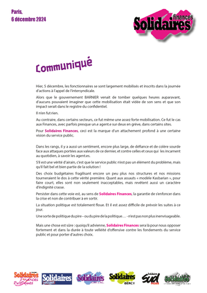Mais une chose est sûre : quoiqu’il advienne, Solidaires Finances sera là pour nous opposer fortement et dans la durée à toute velléité d’offensive contre les fondements du service public et pour porter d’autres choix.