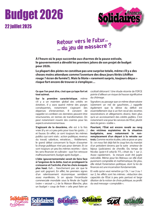 S’agissant de la deuxième, elle est à la fois vraie (il y en a à peu près pour tous les goûts…) et fausse. En effet, ce sont toujours les mêmes publics qui sont visés : action publique, revenus du travail, salarié.es, retraité.es… Visiblement, le grand débat concernant la façon d’assumer la charge publique n’est pas pour demain. Et ce sont toujours un peu les mêmes recettes – dans les sens financier et culinaire - que l’on retrouve malheureusement, budget après budget…