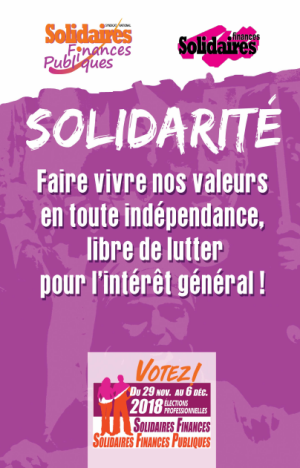Représentatifs, combatifs et unitaires, nous sommes Solidaires sur tous les fronts de la fiscalité et des Finances Publiques pour gagner la bataille des idées et ainsi défendre les intérêts individuels et collectifs de tous les agents de la DGFiP.
