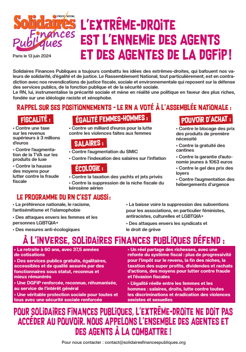 13 juinL’extrême-droite est l’ennemie des agents et des agentes de la DGFiP ! |