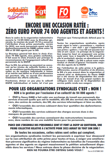 Toutes les organisations syndicales, après avoir signé le volet « promotions », rejettent cette prime « one shot » qui s’apparente à une prime « galère » ! Les OS ont assumé leur rôle et ont « joué » le principe de la négociation jusqu’au bout en proposant une prime socle pour tous à laquelle la DG pouvait si elle le souhaitait, ajouter un abondement différencié « GMBI ». La DG a refusé notre main tendue et choisit d’ignorer l’écrasante majorité des agents de la DGFiP.