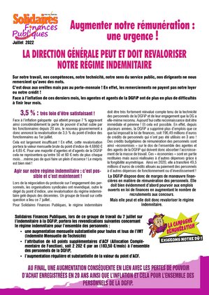 Solidaires Finances Publiques y portera de manière pugnace les revendications des agentes et des agents qui ont perdu près de 25% de pouvoir d'achat en 20 ans qui subissent également de plein fouet l'inflation qui atteint les 7% en cet été 2022.