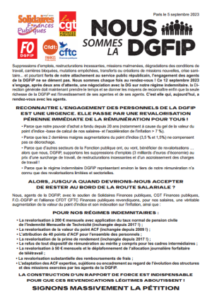 Pour appuyer les revendications légitimes, les syndicats Solidaires Finances Publiques, CGT Finances Publiques FO-DGFiP ainsi que l'alliance CFDT-CFTC Finances Publiques vous invitent à signer massivement le tract pétition qui circulera dans vos services.