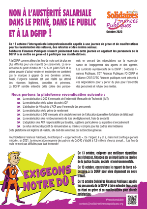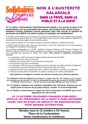 Ce 13 octobre l’intersyndicale interprofessionnelle appelle à une journée de grève et de manifestations pour la revalorisation des salaires, des retraites et des minima sociaux. Solidaires Finances Publiques s’inscrit pleinement dans cette journée en appelant les personnels de la DGFiP à se mettre en grève et à participer aux manifestations.