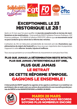 Après ce 23 mars que l’on peut qualifier de journée exceptionnelle en termes de manifestations et de mobilisations, l’intersyndicale DGFiP Solidaires Finances Publiques, CGT Finances publiques, F.O.-DGFiP et l’alliance CFDT/CFTC affirme que ce mouvement social ne peut conduire qu’au retrait de la réforme des retraites.
