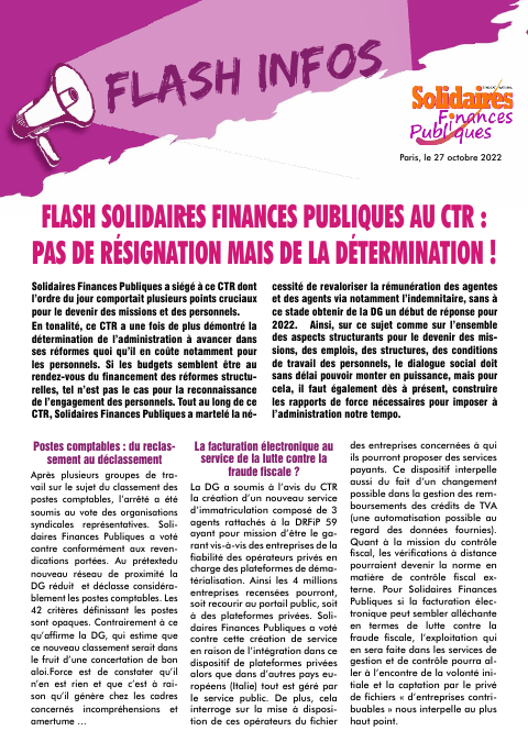 La DG a soumis à l’avis du CTR la création d’un nouveau service d’immatriculation composé de 3 agents rattachés à la DRFiP 59 ayant pour mission d’être le garant vis-à-vis des entreprises de la fiabilité des opérateurs privés en charge des plateformes de dématérialisation. Ainsi les 4 millions entreprises recensées pourront, soit recourir au portail public, soit à des plateformes privées. Solidaires Finances Publiques a voté contre cette création de service en raison de l’intégration dans ce dispositif de plateformes privées alors que dans d’autres pays européens (Italie) tout est géré par le service public. De plus, cela interroge sur la mise à disposition de ces opérateurs du fichier des entreprises concernées à qui ils pourront proposer des services payants. Ce dispositif interpelle aussi du fait d’un changement possible dans la gestion des remboursements des crédits de TVA (une automatisation possible au regard des données fournies). Quant à la mission du contrôle fiscal, les vérifications à distance pourraient devenir la norme en matière de contrôle fiscal externe. Pour Solidaires Finances Publiques si la facturation électronique peut sembler alléchante en termes de lutte contre la fraude fiscale, l’exploitation qui en sera faite dans les services de gestion et de contrôle pourra aller à l’encontre de la volonté initiale et la captation par le privé de fichiers « d’entreprises contribuables » nous interpelle au plus haut point.