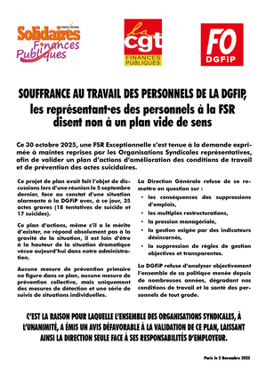 Ce 30 octobre 2025, une FSR exceptionnelle s’est tenue à la demande exprimée à maintes reprises par les Organisations Syndicales représentatives, afin de valider un plan d’actions d’amélioration des conditions de travail et de prévention des actes suicidaires. Ce projet de plan avait fait l’objet de discussions lors d’une réunion le 5 septembre dernier, face au constat d’une situation alarmante à la DGFiP avec, à ce jour, 35 actes graves (18 tentatives de suicide et 17 suicides).