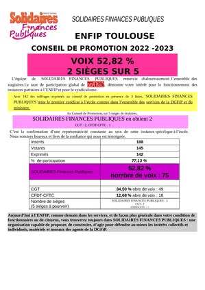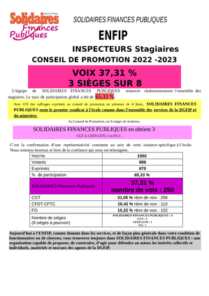 Aujourd’hui à l’ENFiP, comme demain dans les services, et de façon plus générale dans votre condition de fonctionnaires ou de citoyens, vous trouverez toujours dans SOLIDAIRES FINANCES PUBLIQUES : une organisation capable de proposer, de construire, d’agir pour défendre au mieux les intérêts collectifs et individuels, matériels et moraux des agents de la DGFiP !