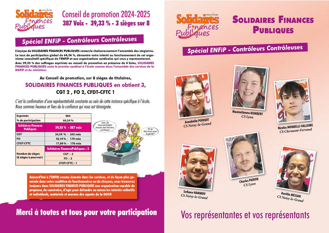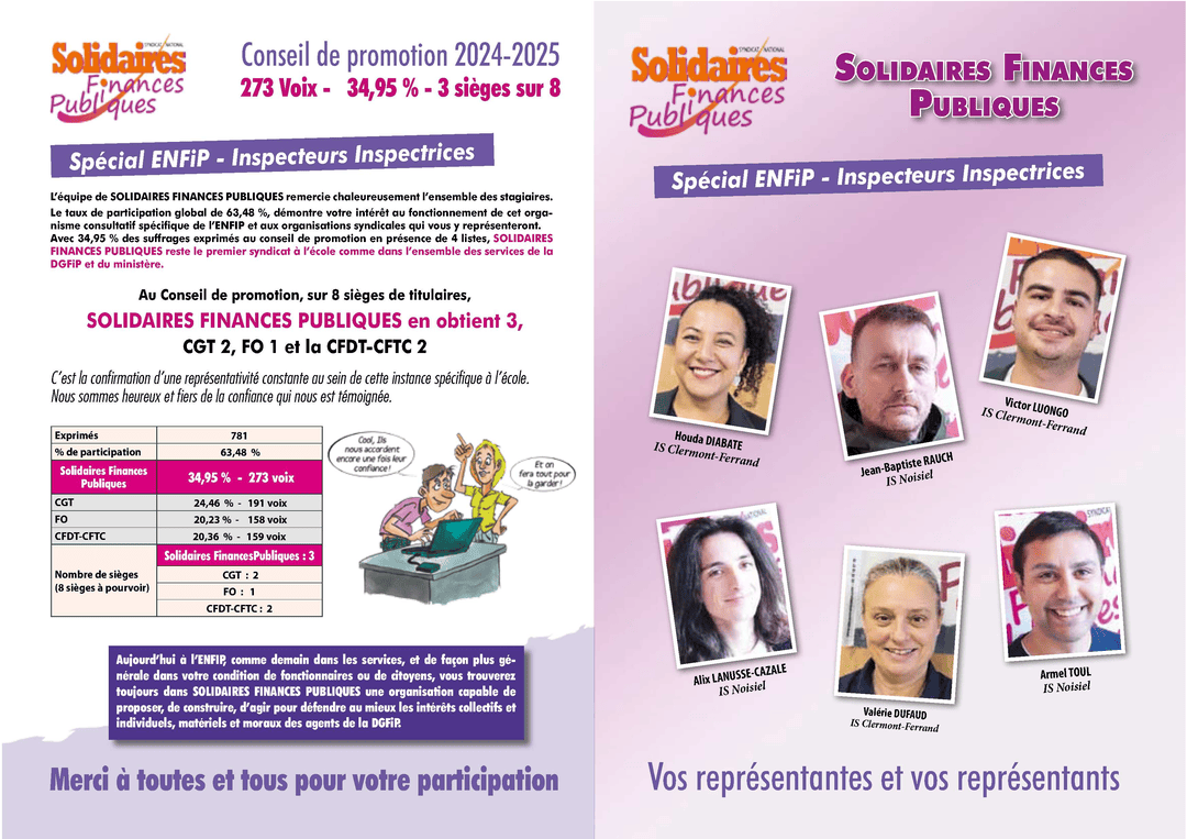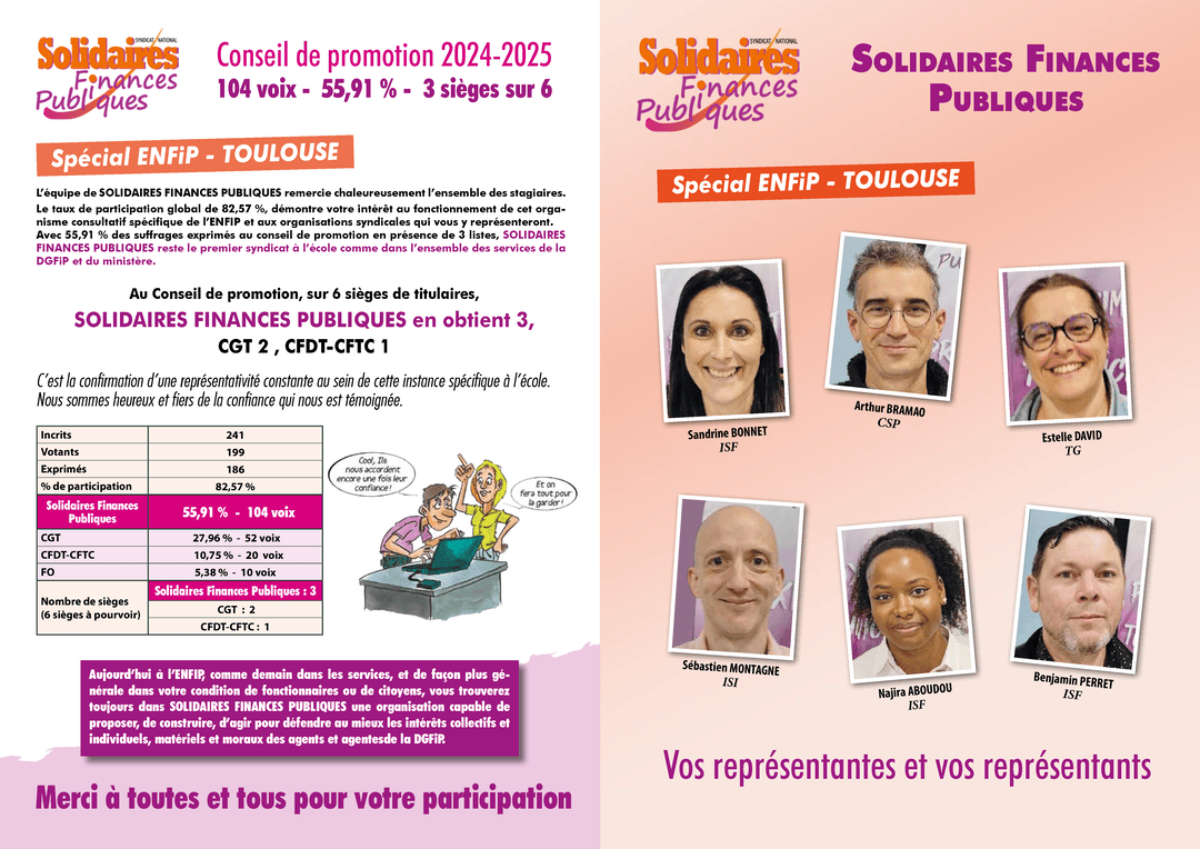 Solidaires Finances Publiques remercie tous les électeurs et électrices qui lui accordent leur confiance, réaffirmant ainsi notre position en tant que première organisation syndicale à la DGFiP et au ministère.