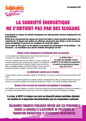 Pour Solidaires Finances Publiques, ces mesures d’économie d’énergie et d’économie budgétaire ne visent qu’une adaptation à une situation conjoncturelle alors que nous avons besoin d’un vrai grand plan de transition énergétique et écologique.