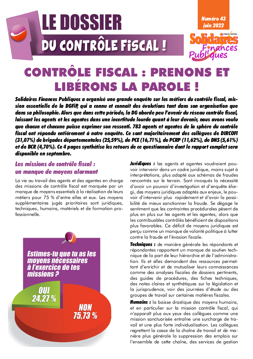 Solidaires Finances Publiques a organisé une grande enquête sur les métiers du contrôle fiscal, mission essentielle de la DGFiP, qui a connu et connaît des évolutions tant dans son organisation que dans sa philosophie.