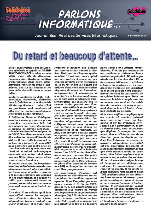 Si la « concertation » que la Direction générale a appelé le GRAND REMUE-MENINGES a bien eu une utilité, c’est celle de démontrer l’ampleur des attentes en matière d’informatique dans notre administration, tant sur les projets eux-mêmes, que sur les besoins et les demandes des utilisateurs au quotidien.