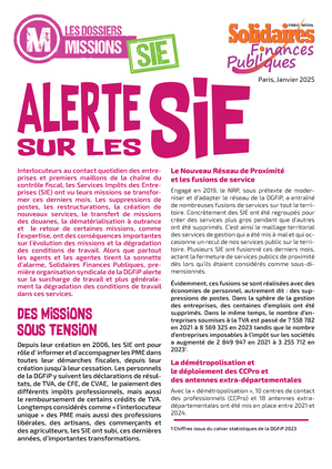 Interlocuteurs au contact quotidien des entreprises et premier maillon de la chaîne du contrôle fiscal, les Services Impôts des Entreprises (SIE) ont vu leurs missions se transformer ces derniers mois. Les suppressions de postes, les restructurations, la création de nouveaux services, le transfert de missions des douanes, la dématérialisation à outrance et le retour de certaines missions, comme l’expertise, ont des conséquences importantes sur l’évolution des missions et la dégradation des conditions de travail. Alors que partout les agents et les agentes tirent la sonnette d’alarme, Solidaires Finances Publiques, première organisation syndicale de la DGFiP alerte sur la surcharge de travail et plus généralement la dégradation des conditions de travail dans ces services.